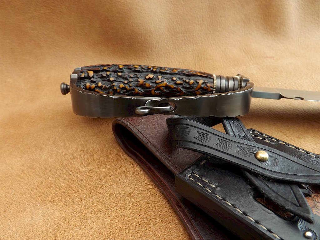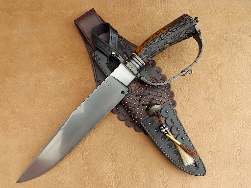 This is the latest knife to come out of the shop. This is a San Antonio D-guard bowie with a two part construction hand guard, an 11" - 283mm long blade made from W-1 high carbon tool steel sporting a clay quenched Hamon and an overall length of 430mm just a tad over 17" long. It has a dyed Sambar stag handle with coined nickel silver spacers, a wrought iron bolster and a hand stitched Mexican belt loop sheath. This knife also comes with… View More