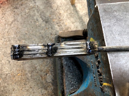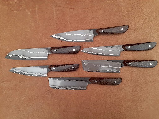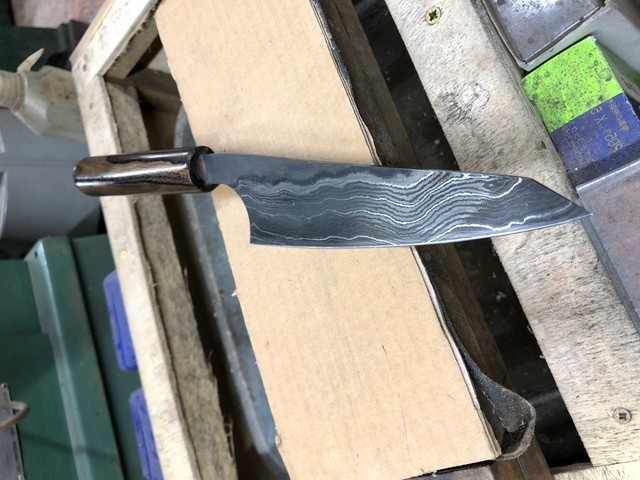 I've just completed my first three day Damascus chef's knife class with a student. On day one Mark made the billet and performed multiple forge welds on it to get his layer count up to 124 layers. The billet was made from 1075 + Cr high carbon tool steel, 15N20 and pure nickel. The blade was also hardened and tempered by the end of the first day. Day two consisted of grinding his blade to shape and then grinding in his primary bevels. No… View More