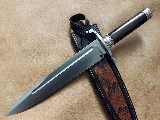 The fullered blade for this spear point Bowie is made from W-1 high carbon tool steel, with a blade length of 255mm, a blade thickness of 5mm on the spine with a 130mm false unsharpened clip on the top edge. The overall length of the knife comes in at 380mm, with a hand guard, grooved bolster and grooved end cap made from 316 stainless steel. There are three coined nickel silver spacers and the handle is made from a beautiful piece of… View More