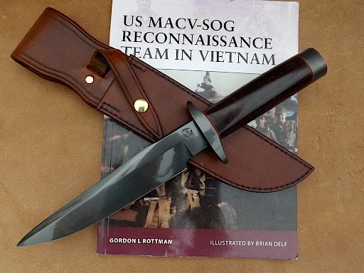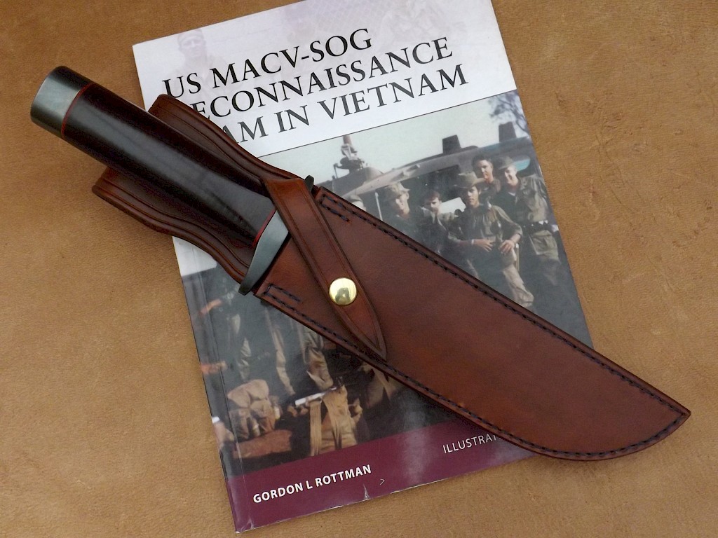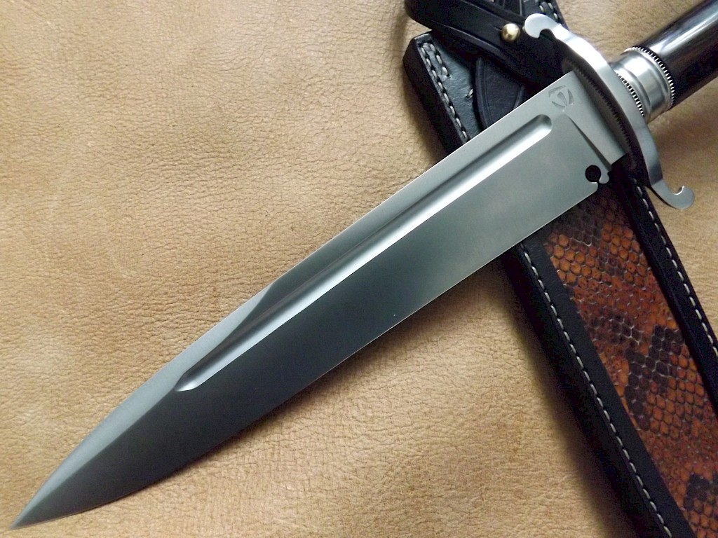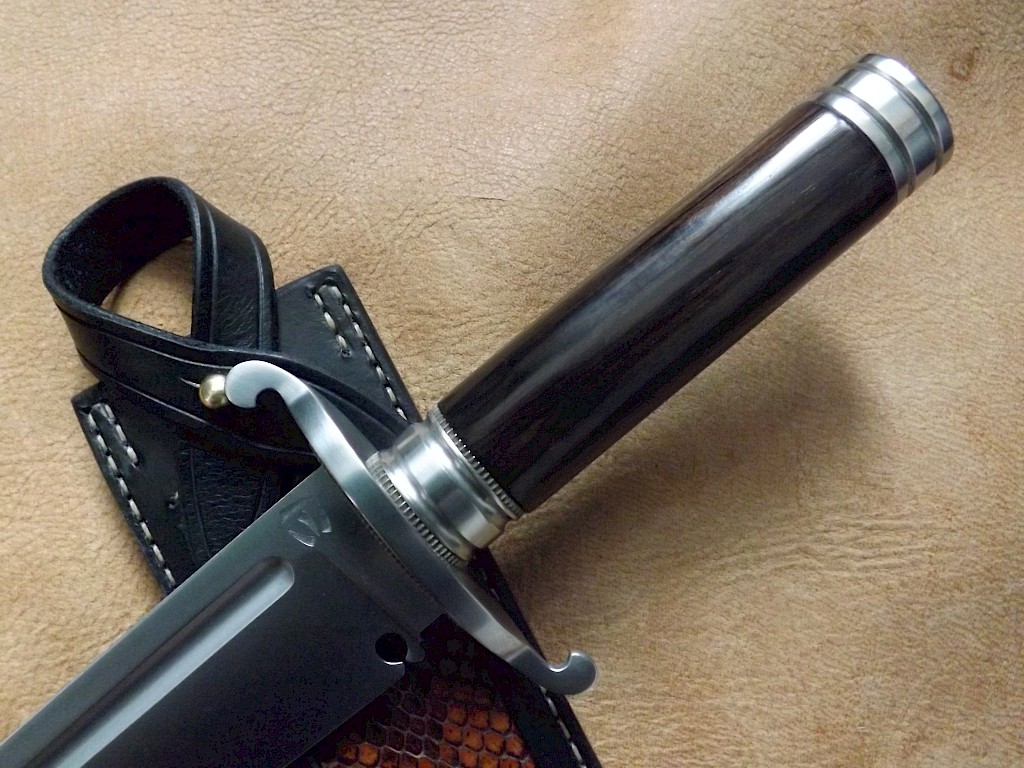 The blade for this knife is made from L-3 high carbon tool steel, the blade has been gun blued, it is 180mm long, is 5.5mm thick on the spine and the overall length of the knife is 305mm. The double branched hand guard and handle bolster are made from gun blued carbon steel, the handle bolster is held in place with a recessed brass barrel nut. The handle is the standard stacked leather washer design which has been dyed mahogany brown and the… View More