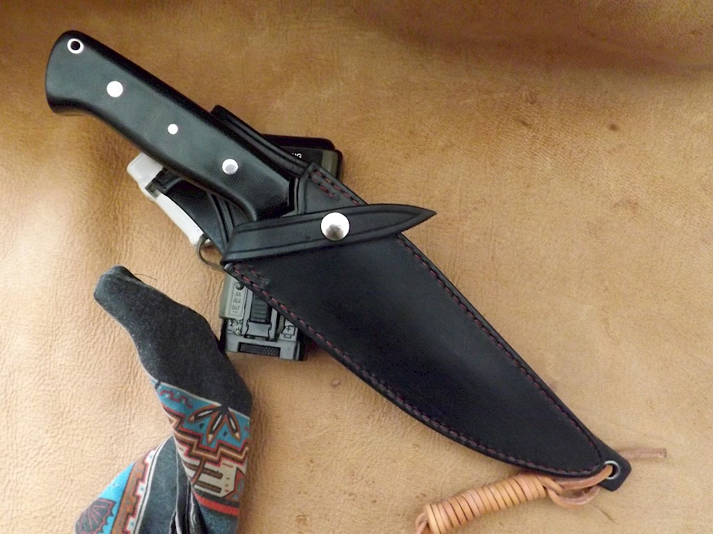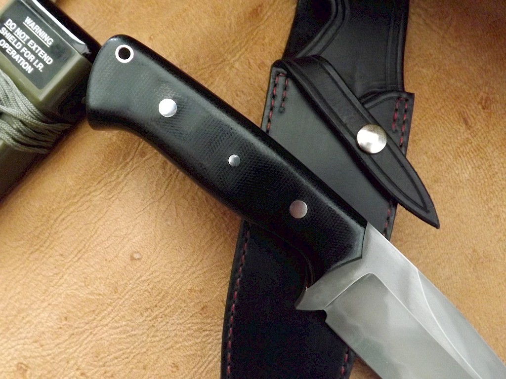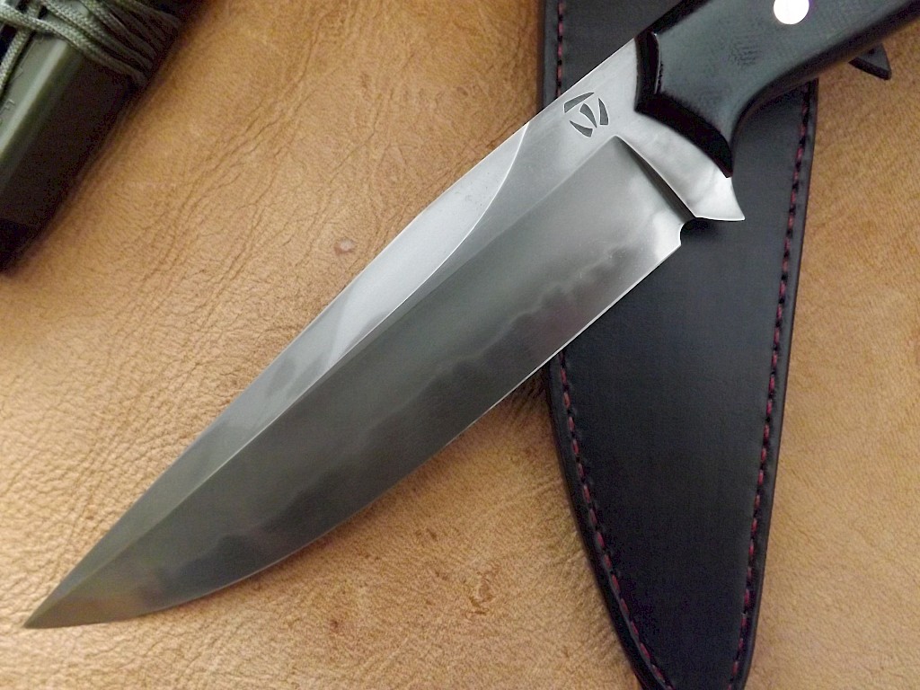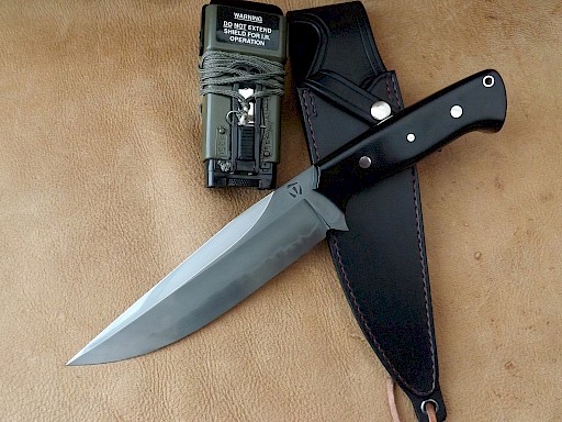 The blade for this knife is made from W-1 high carbon tool steel, it has a blade length of 178mm, a blade thickness of just over 5.5mm and the overall length of the knife is 305mm. The blade has been coated with clay and quenched in water to produce a quite vivid Hamon. The handle scales are black canvas Micarta with red liners, held with two stainless Corby bolts, one three milimeter stainless pin and a stainless thong tube. The double… View More