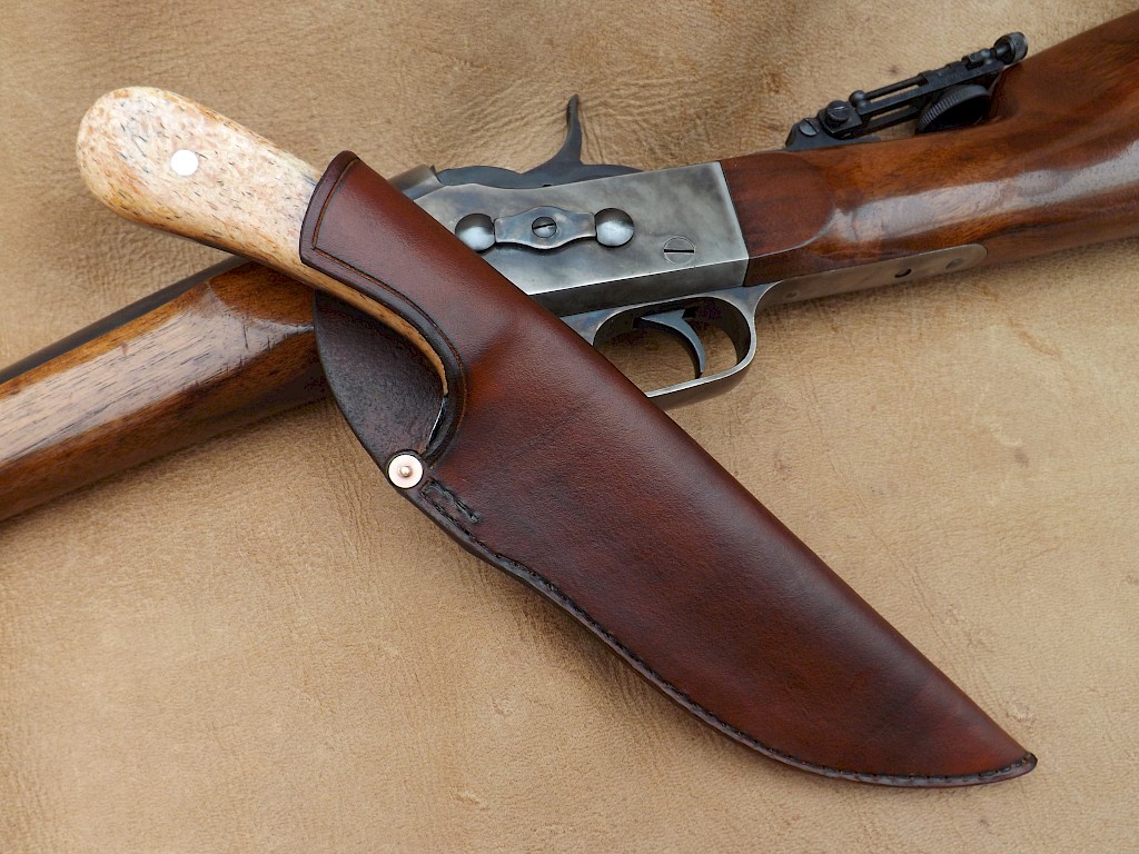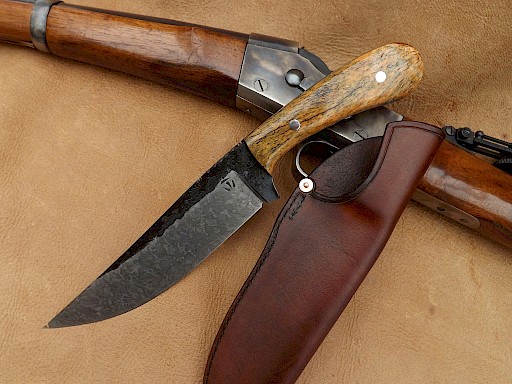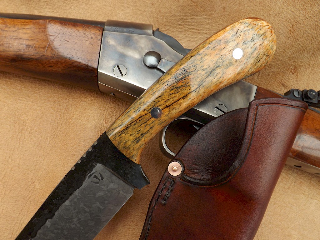 Buffalo hunter style Bowie The blade for this knife is made from W-1 high carbon tool steel, the blade lenght is 180mm, it is 5.5mm thick on the spine. The blade flats have been left rough forged and the primary bevels and the spine have had a forced mustard etch patina applied. The overall length of the knife is 300mm. The handle scales are made from stabilised giraffe bonewhich are held with two S/S Corby bolts. The… View More