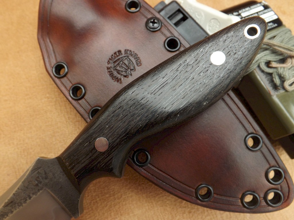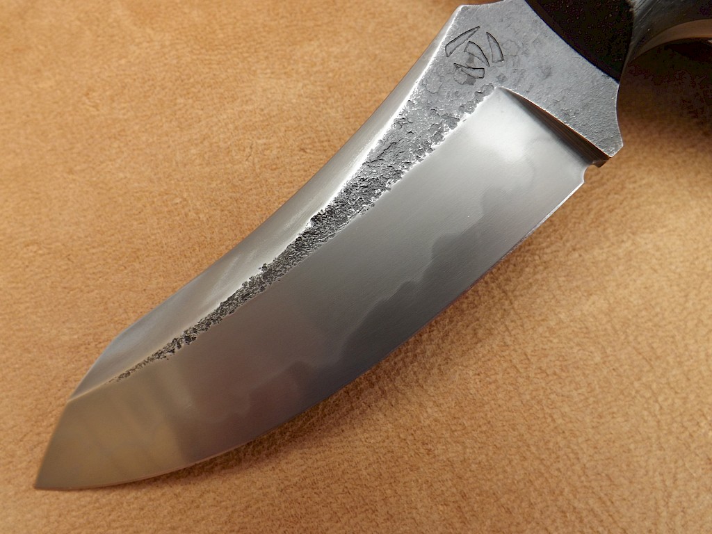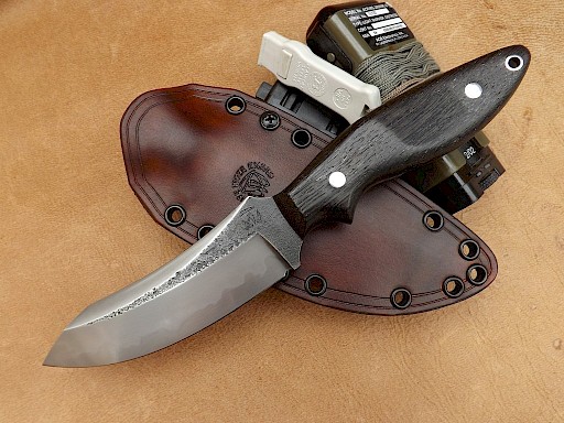 The hand forged blade for this hunter is made from W-1 high carbon tool steel which has had clay applied to produce a vivid Hamon. The blade length is 120mm, blade thickness is 5mm on the spine and it's overall length is 245mm. The tip of the blade has been ground into a diamond point which gives it great strength and powerful piercing qualities. The handle scales are made from 3,000 year old English bog oak with red fibre liners which are… View More